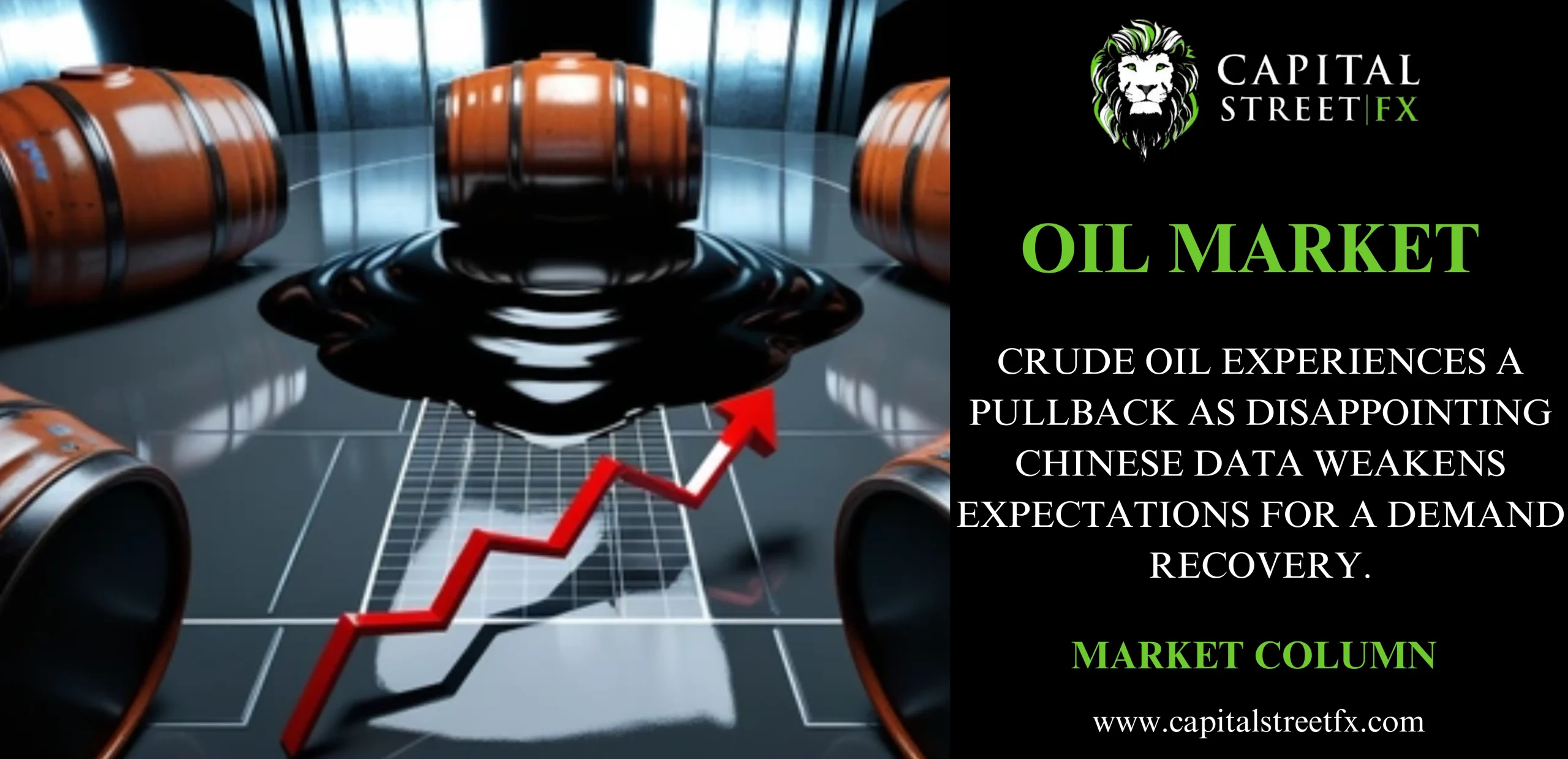 Crude oil experiences a pullback as disappointing Chinese data weakens expectations for a demand recovery.