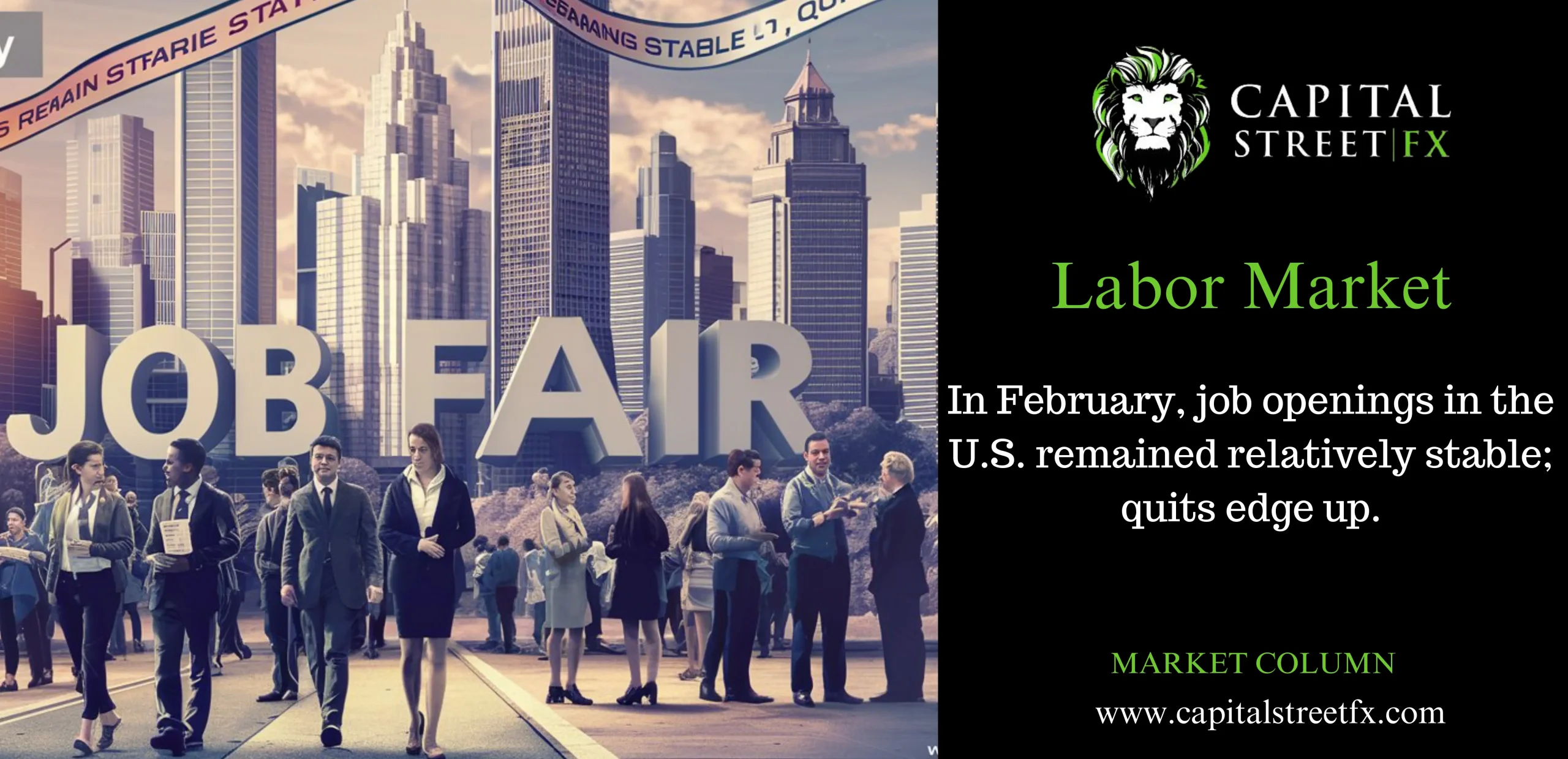 In February, job openings in the United States remained steady at elevated levels, while there was a slight uptick in the number of individuals voluntarily leaving their jobs.