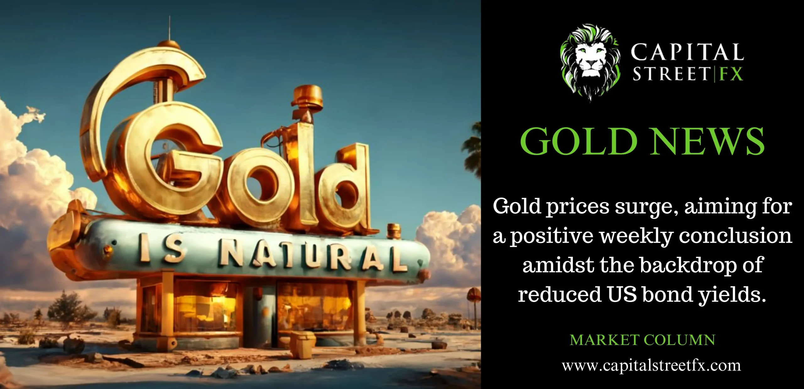 Gold prices surge, aiming for a positive weekly conclusion amidst the backdrop of reduced US bond yields.