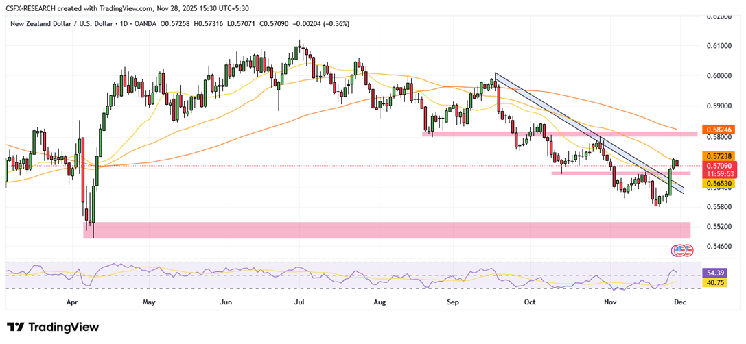 NZD/USD is easing from its four-week high near 0.5730, yet remains well supported above the 0.5700 level, heading for a weekly gain of 1.7%—its strongest since May. The minor pullback is driven by a modest US Dollar rebound, though the broader bullish tone for the Kiwi remains intact.
