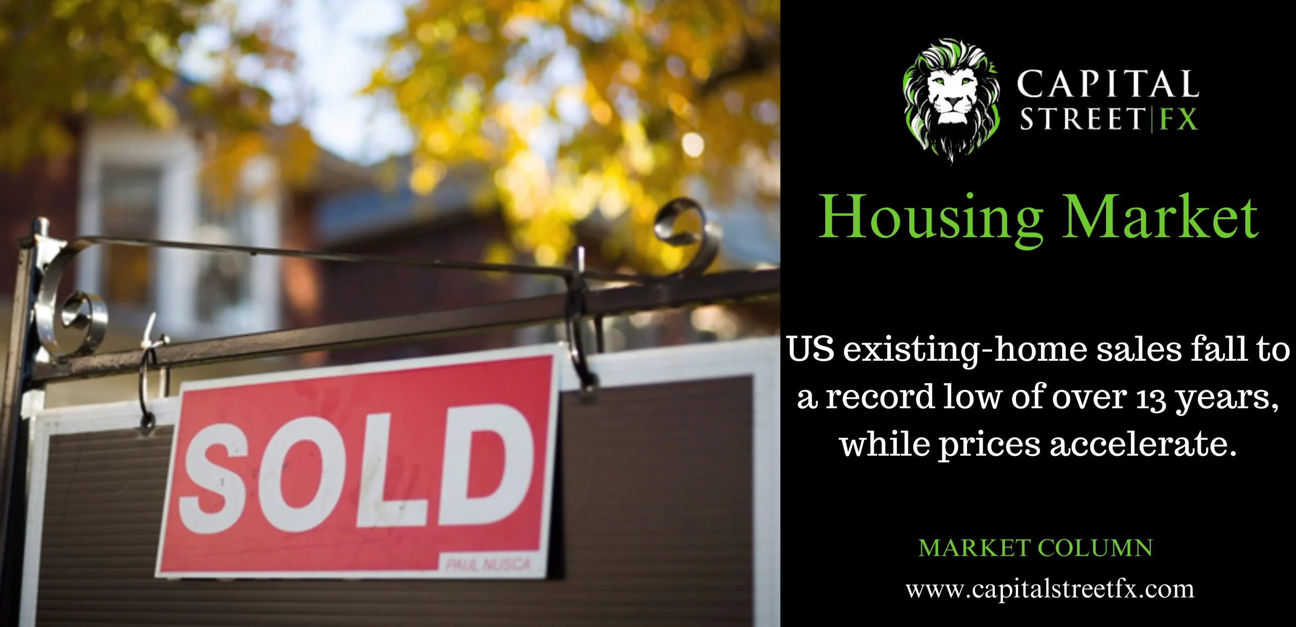 US existing-home sales fall to a record low of over 13 years, while prices accelerate.