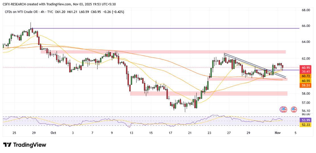 WTI maintains its bullish bias above the recent breakout zone, supported by the 50-EMA at $60.55. Sustained momentum above $60.80 could push prices toward $61.80 and $62.80, with extended gains possible near $64.00.